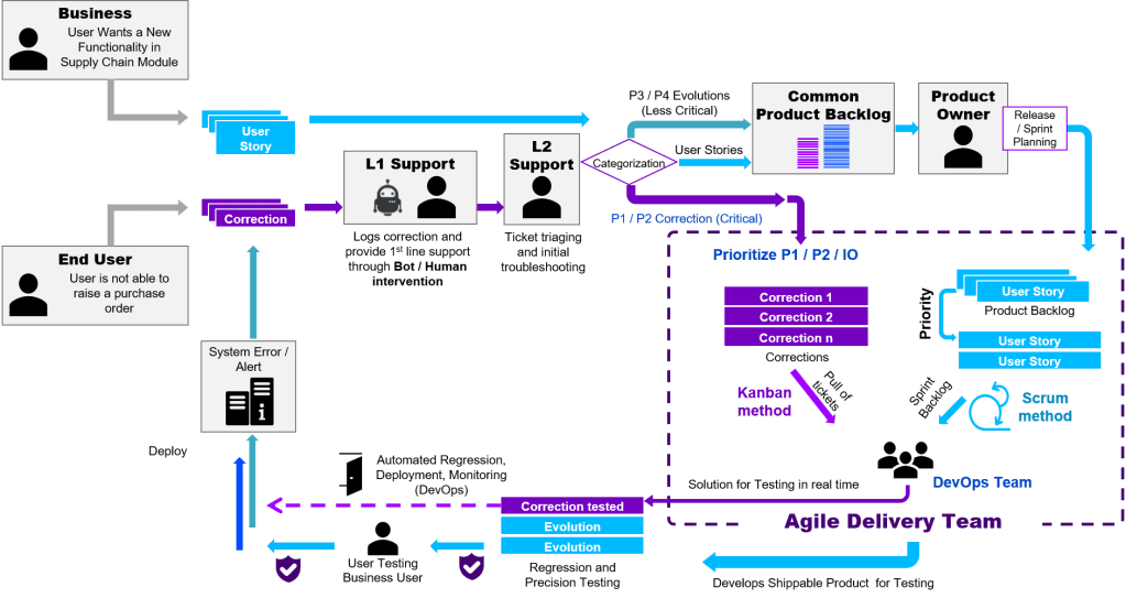Getting the balance right between all these things within a team or to split it out to multiple teams has been a fascinating discussion with my clients this year. I am very much looking forward to see this at large scale in 2020. Last year this idea really became mainstream and more and more clients asked for this type of delivery – finally ;-). Here is a simple systematic picture of the associated flow of work: