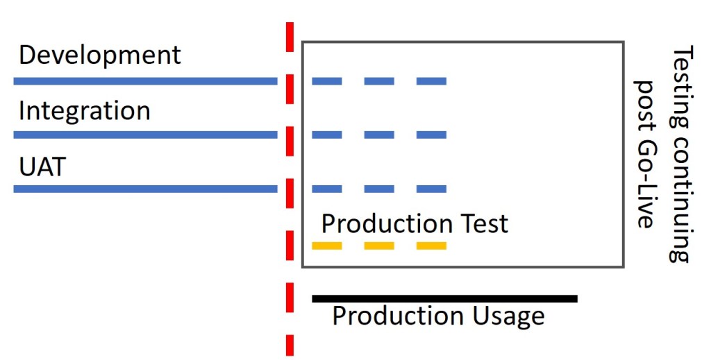 You might notice that the two points are not the same, which means testing does not have to stop at Go-Live. The idea of continuing testing after the release is not new. Some companies have always used production for some testing that wasn’t possible in non-production environments.