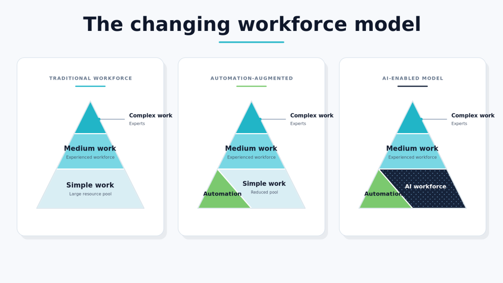 In many organisations, the traditional progression model had already become harder to sustain. A lot of entry-level or more routine work had moved offshore. Teams became thinner in some locations. The work left behind often skewed toward coordination, oversight, integration and stakeholder management. That created a familiar problem: if fewer people get to do the foundational work, where exactly do future seniors come from?