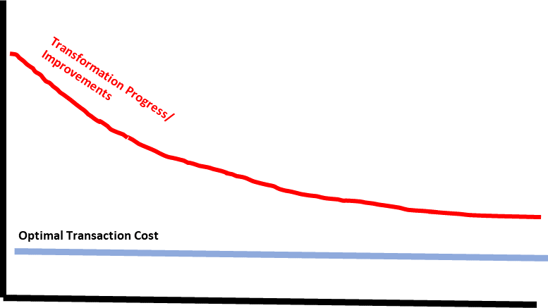 The optimal transaction cost is a theoretical construct – it represents the minimum possible time and effort it could take to deploy and validate code in production. All the manual steps like manual testing, approvals, deployments, and infrastructure changes increase the cost above the minimum transaction cost. Automated but not optimised steps like unnecessary scans or build processes also increase the transaction cost. You can assume that we will never achieve the optimal transaction cost as the incremental cost to improve transaction costs further become uneconomic at some stage. Transaction cost improvements as part of transformations usually follow an asymptotic curve – or the law of diminishing returns.