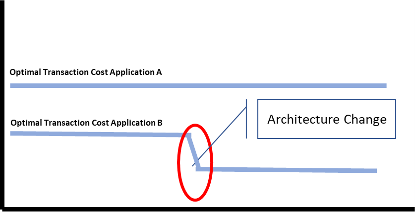 This graph shows two applications one being a larger packaged software, and the other being a smaller custom application. The optimal transaction costs are different as mentioned.