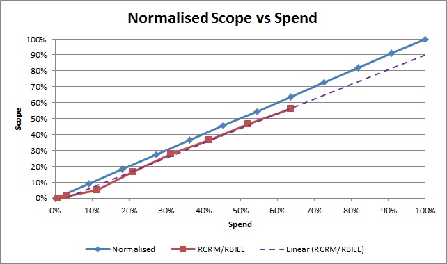 The beauty is that you can show all kinds of things on this graph. In the example shown here, we track the progress of accepted scope against the budget (point 4) that we have used (and yes we are falling behind, looks like we need more budget to deliver our scope). Of course you can do the same for scope vs. schedule. And because these reports are relative to 100% of scope, budget or schedule you can now compare your status reports across teams. We are all aware that status is not linear and that the ideal line is mostly to be ignored, but if after the release has finished you look back at the teams that were successful and those that had challenges you can look for patterns. What percentage of scope did successful teams delivery after 50% of their schedule? How much budget did they have left after they completed 90% of the scope? Through this insight you can develop a portfolio view that I describe later.